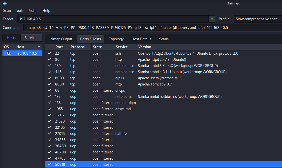 Salida de Zenmap tras ejecutar un escaneo Nmap, identificando servicios como SSH, HTTP, Samba y Tomcat en el sistema objetivo.