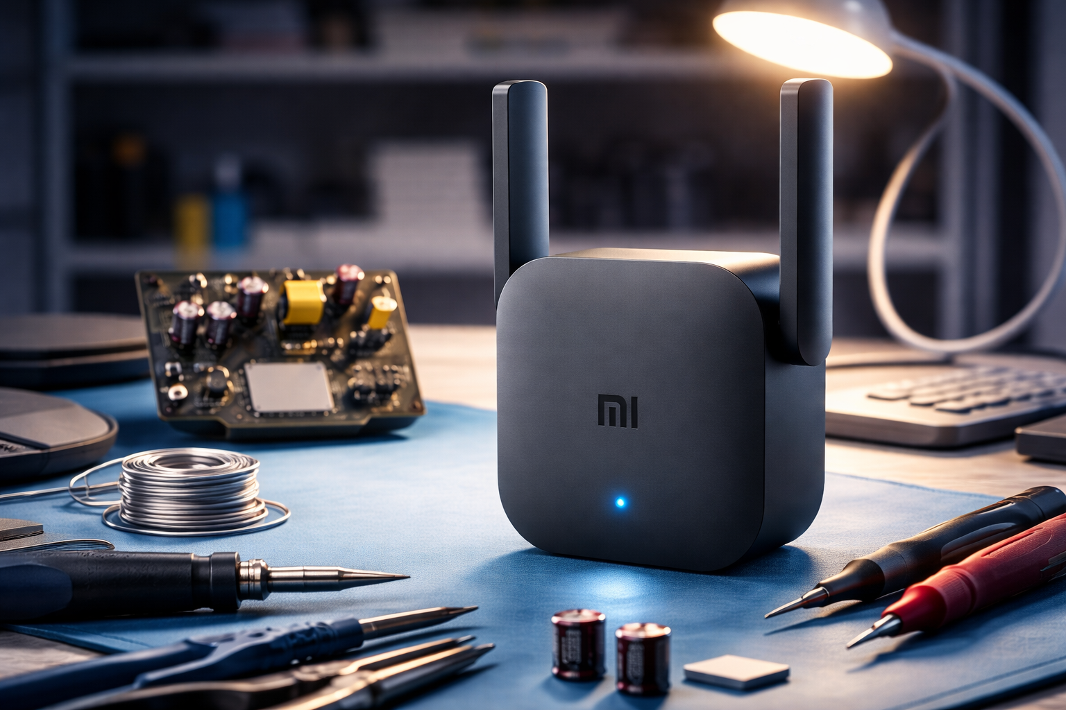 Imagen representativa del proceso de reparación del Xiaomi Mi WiFi Repeater Pro. El dispositivo aparece funcionando con el LED azul encendido tras sustituir los condensadores de la fuente flyback, una avería común en repetidores WiFi y routers domésticos.