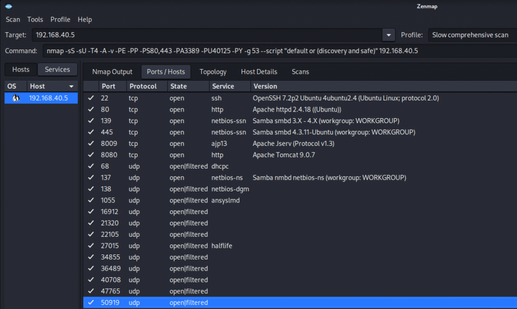 Imagen 1. Salida de Zenmap tras ejecutar un escaneo Nmap, identificando servicios como SSH, HTTP, Samba y Tomcat en el sistema objetivo.