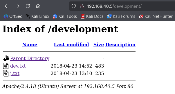 En la enumeración se ha encontrado el directorio /development. Al acceder a esta carpeta se encuentran dos ficheros de texto: j.txt y dev.txt.